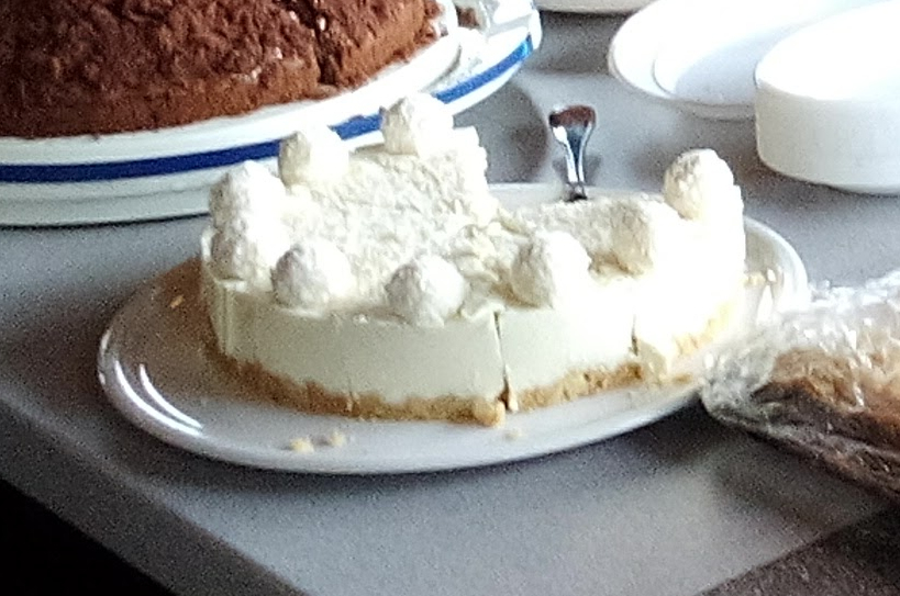 Auf die Idee, mit dem Exquisa zu backen, kam ich relativ schnell. Nicht zuletzt, weil neben 2 Geburtstagen auch noch ein Fest in unserem Gartenverein stattfand, für das ich einen Kuchen spenden wollte. Da einer meiner Lieblingskuchen eine Frischkäse-Torte ist, für die man normalerweise ganz einfachen Doppelrahm-Frischkäse verwendet, war der Weg zu einer Kokos-Frischkäse-Torte nicht weit. Ich habe also eigentlich nur den Käse ausgetauscht, später Kokosraspeln und zur Deko noch Raffaelos obenauf gegeben – fertig war mein Kuchen. Diesen habe ich überdies nicht zu Hause gemacht – sondern im Garten, in dem ich ebenso wie im Wohnwagen keinen Backofen habe. Und was soll ich sagen – er schmeckte köstlich! Also, wenn ihr Kokos mögt, solltet ihr diesen Kuchen einfach mal ausprobieren: