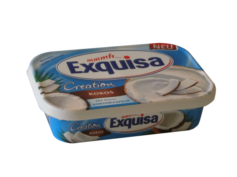 Passenderweise durfte ich an einem Produkttest teilnehmen, der vom Lisa Freundeskreis durchgeführt wurde. Es ging dabei um die neue Frischkäse-Sorte „Kokos“ der Marke Exquisa. Gleich 10 Packungen davon bekam ich vor 2 Wochen zugeschickt. Natürlich nicht nur für mich alleine – fleissig habe ich die Päckchen auch im Kreise der Familie verteilt. Dennoch blieben mir immer noch 3 Packungen.