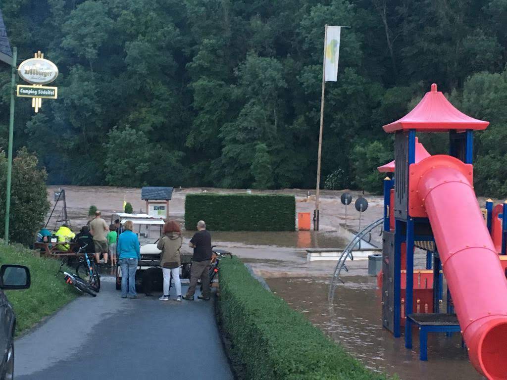 Dirk Heck, Inhaber des Campingplatz Südeifel, teilte uns gegen 14.10 Uhr die Hiobsbotschaft mit: „Sofortige Räumung des Campingplatzes, eine Flutwelle ist auf dem Weg zu uns.“ Am Stausee Bitburg wurde zu diesem Zeitpunkt bereits vermehrt Wasser abgelassen. Erste Gerüchte kursierten, da sei etwas schief gelaufen. Dazu später mehr.