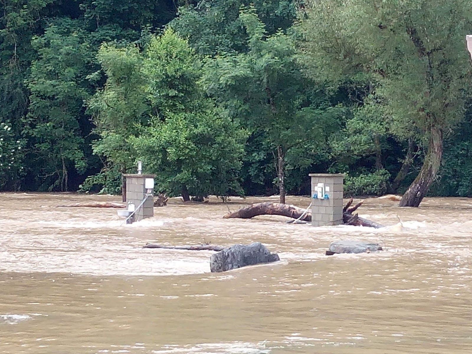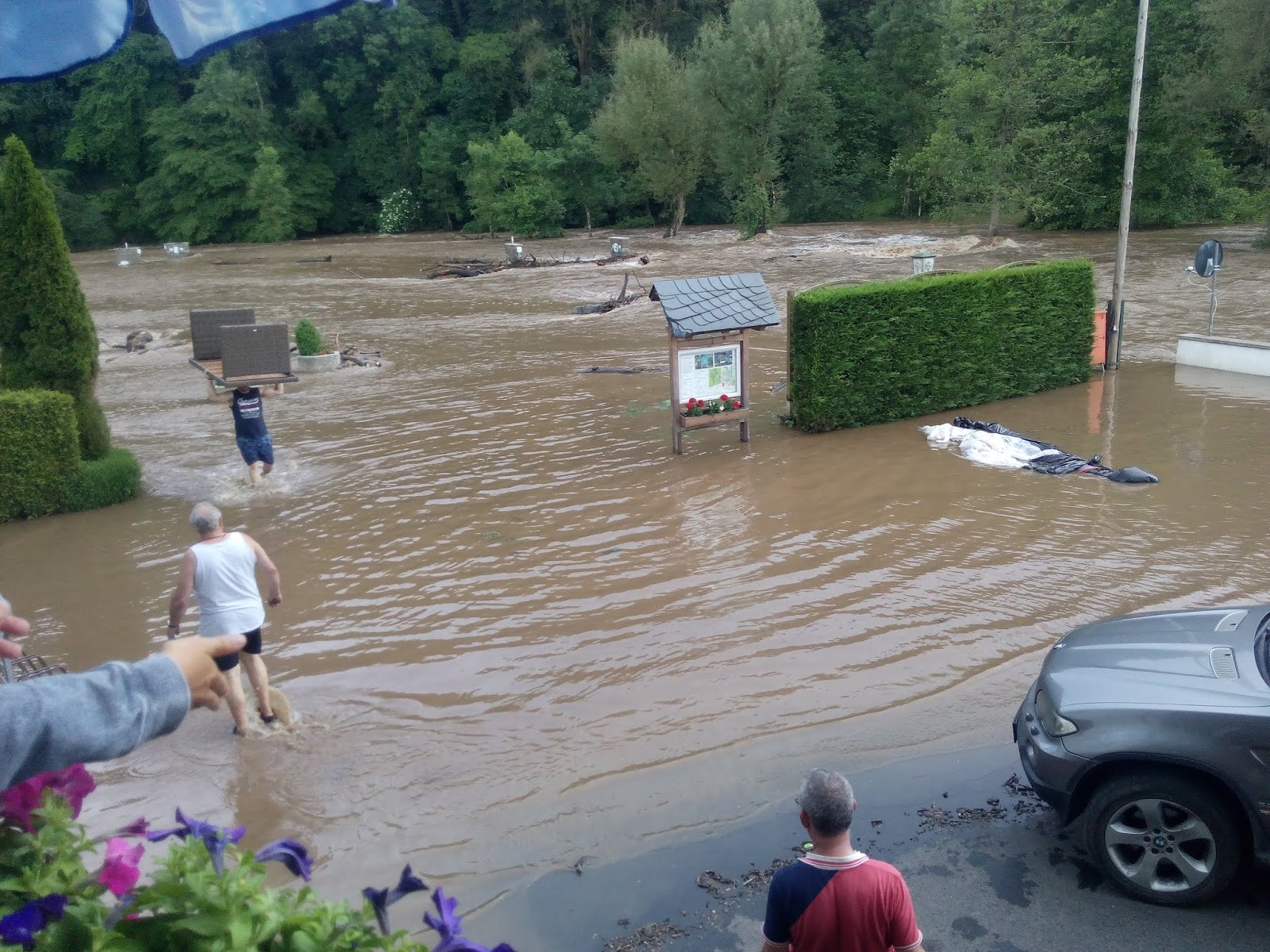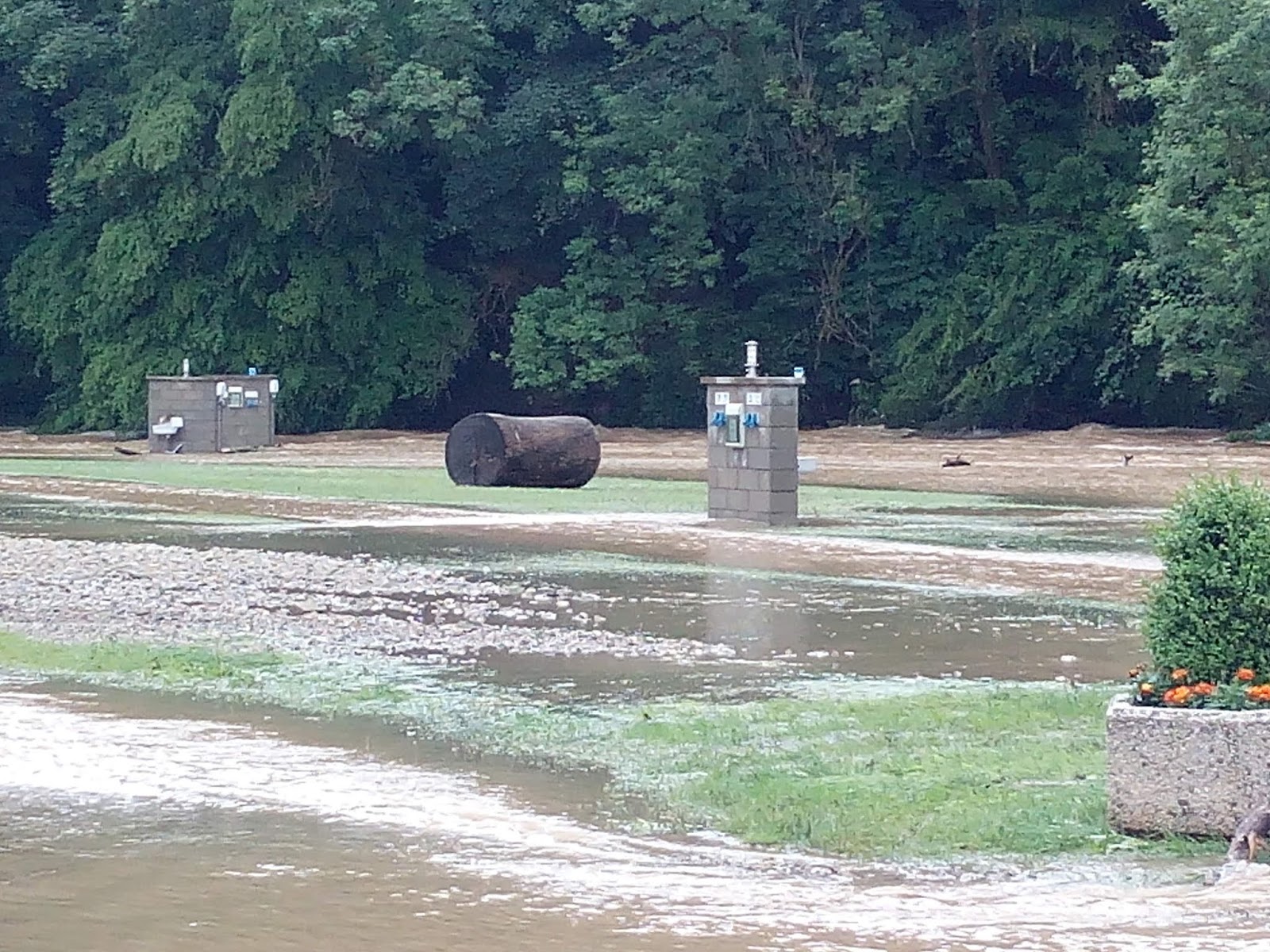 Unermüdlich arbeiteten die Helfer, um auch noch den letzten Wohnwagen vom Platz zu zerren. Immer mit dem Schulterblick auf die Prüm, die stetig anstieg und am Anfang des Platzes schon die ersten Standplätze zu überschwemmen begann. Dabei war es nicht nur das Wasser, was gefährlich nahe kam, auch ganze Baumstämme wurden mit den Wassermassen mitgerissen. Die Fließgeschwindigkeit war enorm, so dass ganze Stammwalzen angerauscht kamen und gegen Bäume krachten, sich vor den Stromsäulen auftürmten und die Außenwaschbecken abrissen.