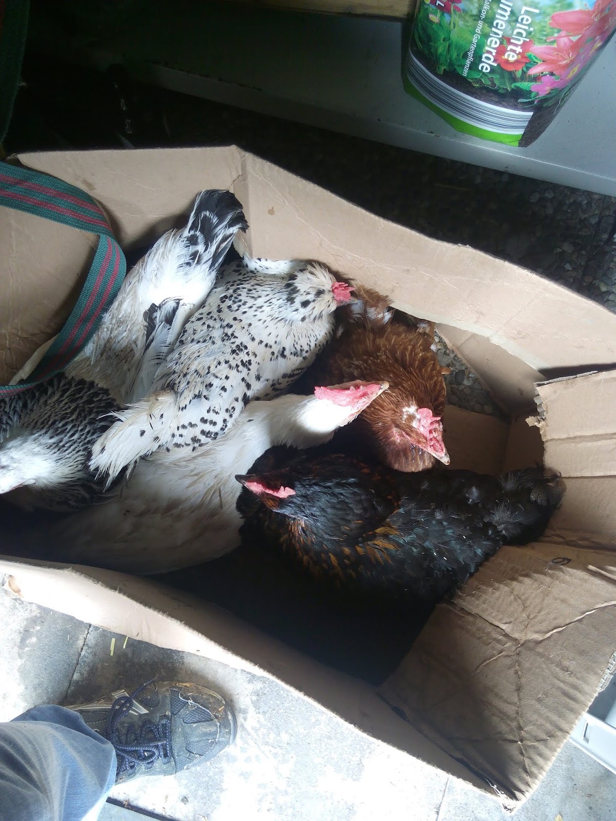 In einer solchen Situation wächst man über sich hinaus und legt alle Scheu ab. Man agiert nur noch. Und schwupps hielt ich das erste Huhn stolz in den Armen. Die Kartons, in die wir die Hühner zunächst stecken wollten, waren allerdings vom Regen durchweicht und bis auf zwei Stück vollkommen unbrauchbar. Dann hatte Annika eine ungewöhnliche, aber in diesem Moment geniale Idee: eine Mülltonne! Gott sei Dank fand sich in direkter Nähe eine leere 240-Liter-Tonne, in die wir einen Teil der Hühner erstmal unterbrachten und aus dem Gefahrenbereich brachten. Natürlich konnten die Tiere darin nicht dauerhaft bleiben, und so brachten wir sie in den Gartenschuppen der Familie Heck. Etwas gestresst, aber in Sicherheit, konnten wir die Tiere dort erst einmal unterbringen.