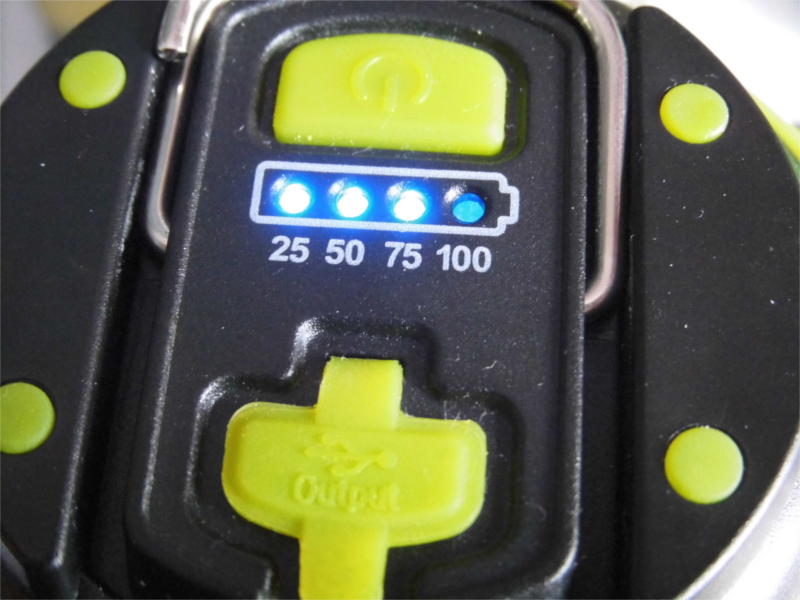 Laut Hersteller hält der Akku sehr lange, bis er aufgeladen werden muss: Der Suchscheinwerfer kann 3 Stunden auf voller Leistung laufen, bis es soweit ist, auf halber Leistung hält er doppelt so lange. Die Campinglaterne hält bei voller Leistung 2,5 Stunden und auf halber Kraft ca. 4,5 Stunden. Den Ladestatus zeigt dabei eine 4-teilige, blaue LED-Leiste an der Rückseite des Gerätes an.