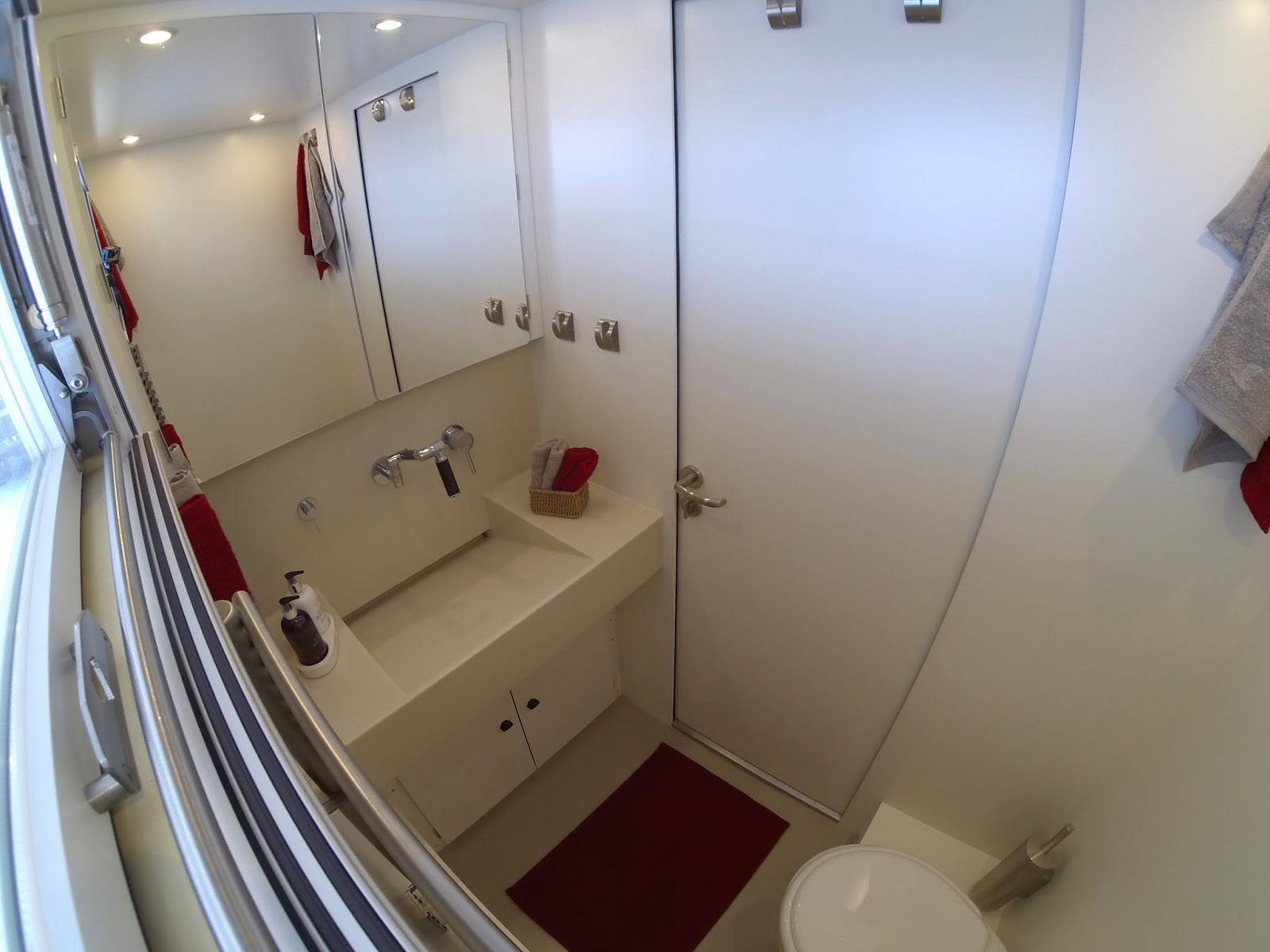 Oberflächen sind in weiß mit Teakholz-Kanten gehalten. Dazu gibt es Teak-Schiffsboden, Wand- und Deckenverkleidung aus Alcantara im Wohn- und Schlafbereich sowie Sitzpolster aus